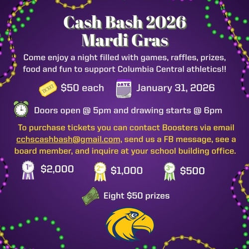 Get ready for a fun-filled Mardi Gras–themed night supporting Columbia Central Athletics! Cash Bash is back, and tickets are selling fast — this event sells out every year!