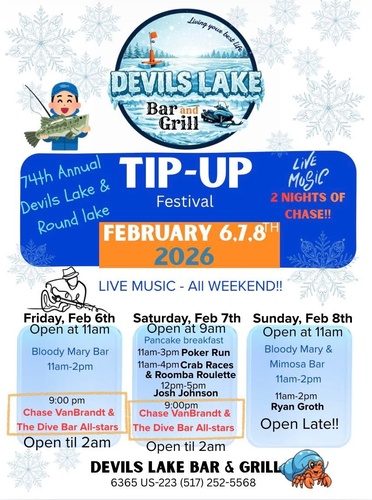 Join Devils Lake Bar and Grill for Tip-Up and live music by Chase VanBrandt & The Dive Bar All Stars
